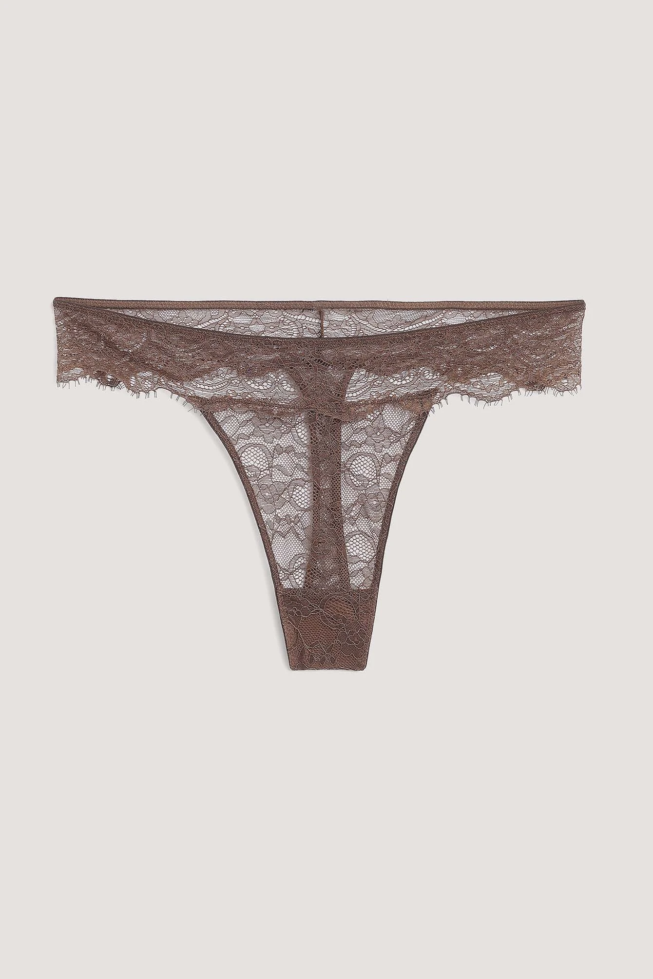 This thong is stretchy and seethrough and features a laced material with floral details.
