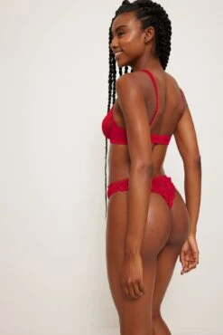 This bra is made of lace and features a bralette design. It has unpadded, soft triangle cups and adjustable shoulder straps.