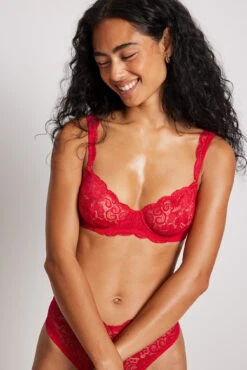 This bra is underwired and made of lace and features a balconette and adjustable shoulder straps.