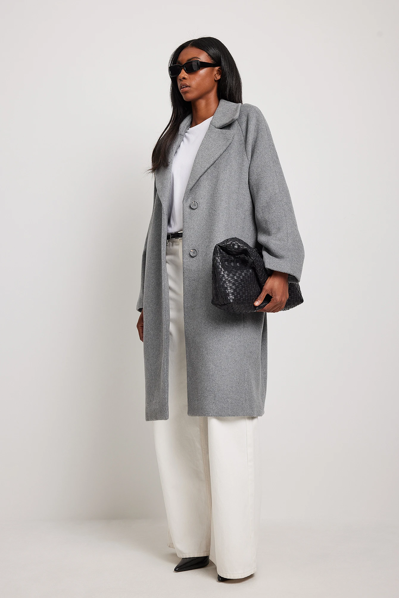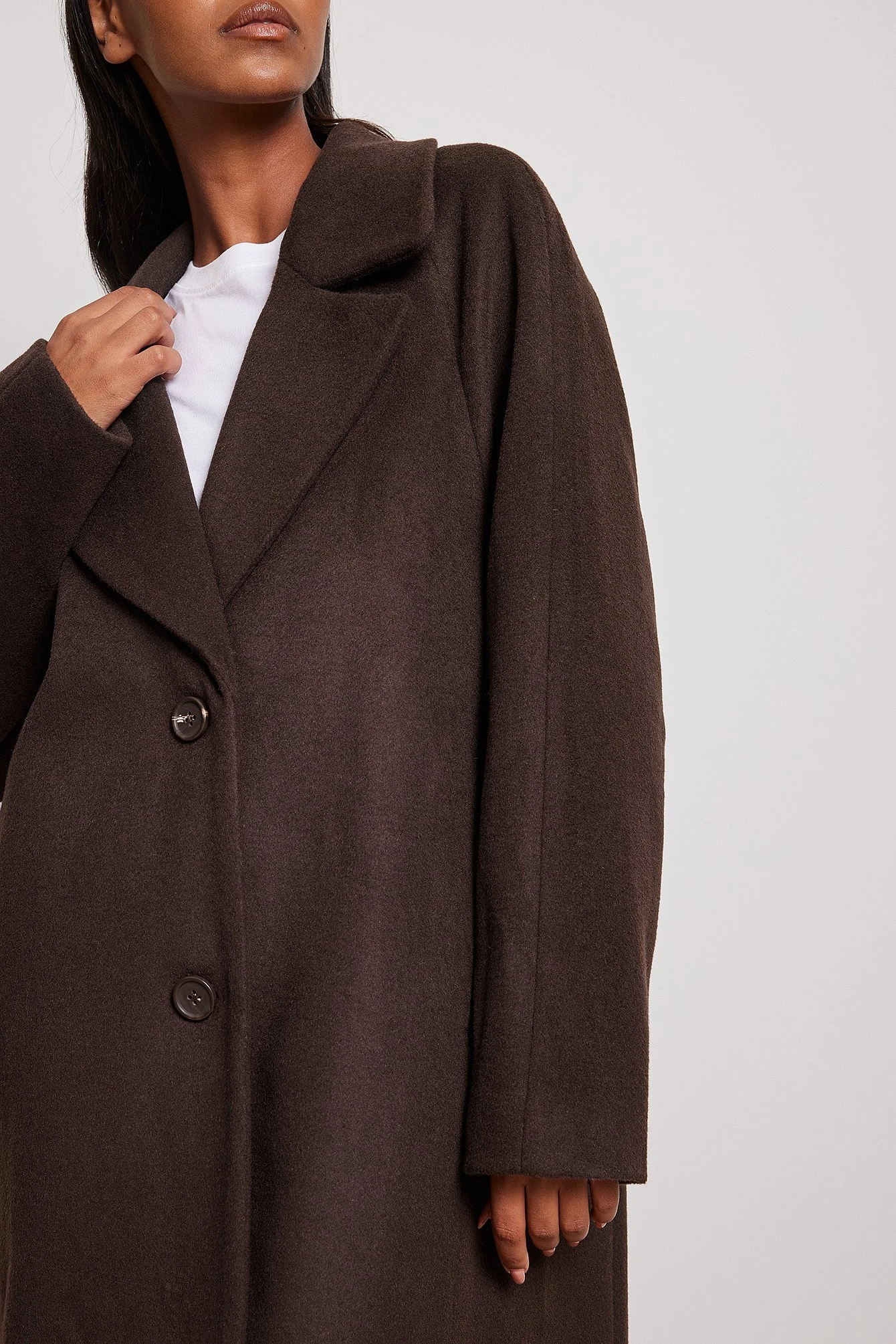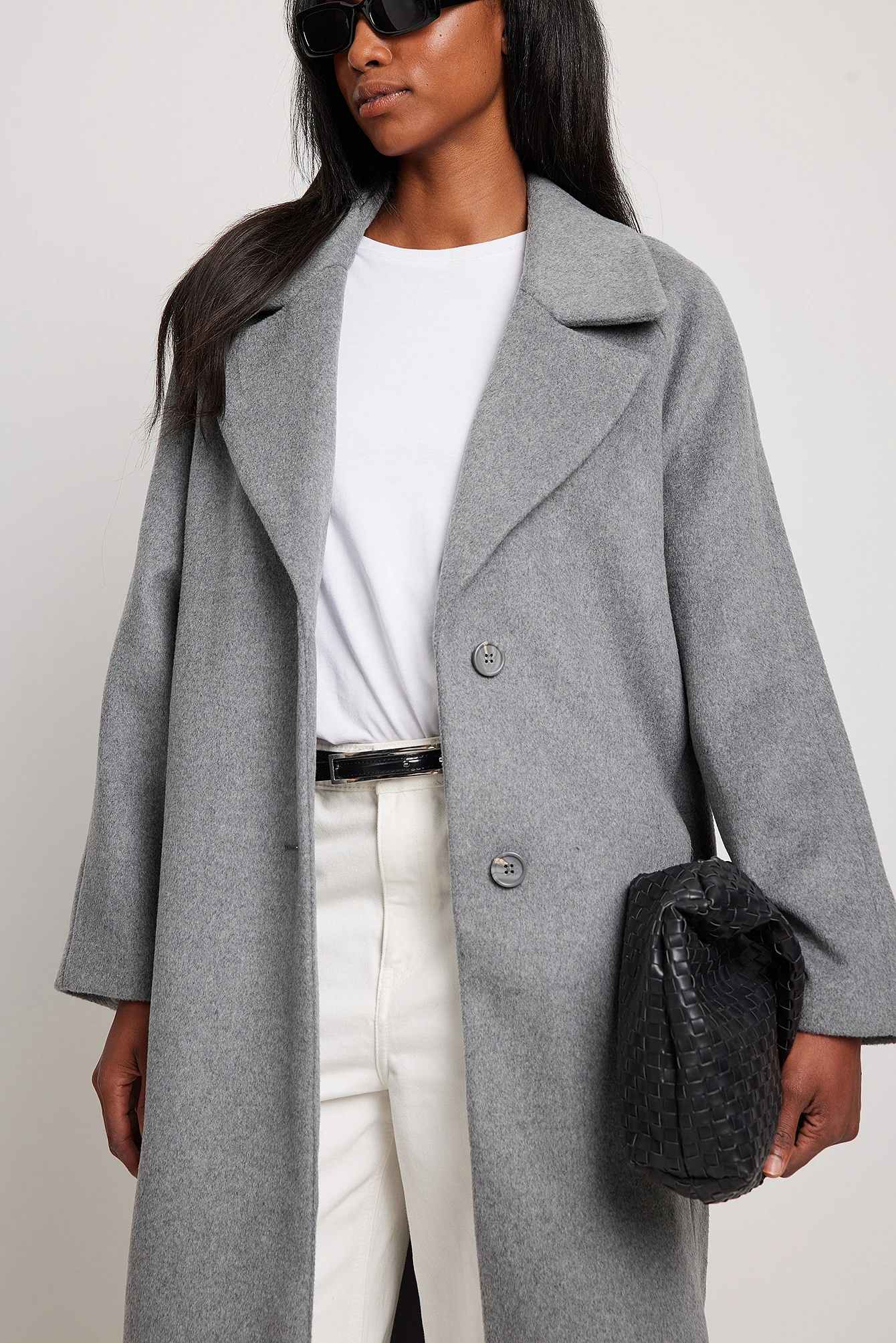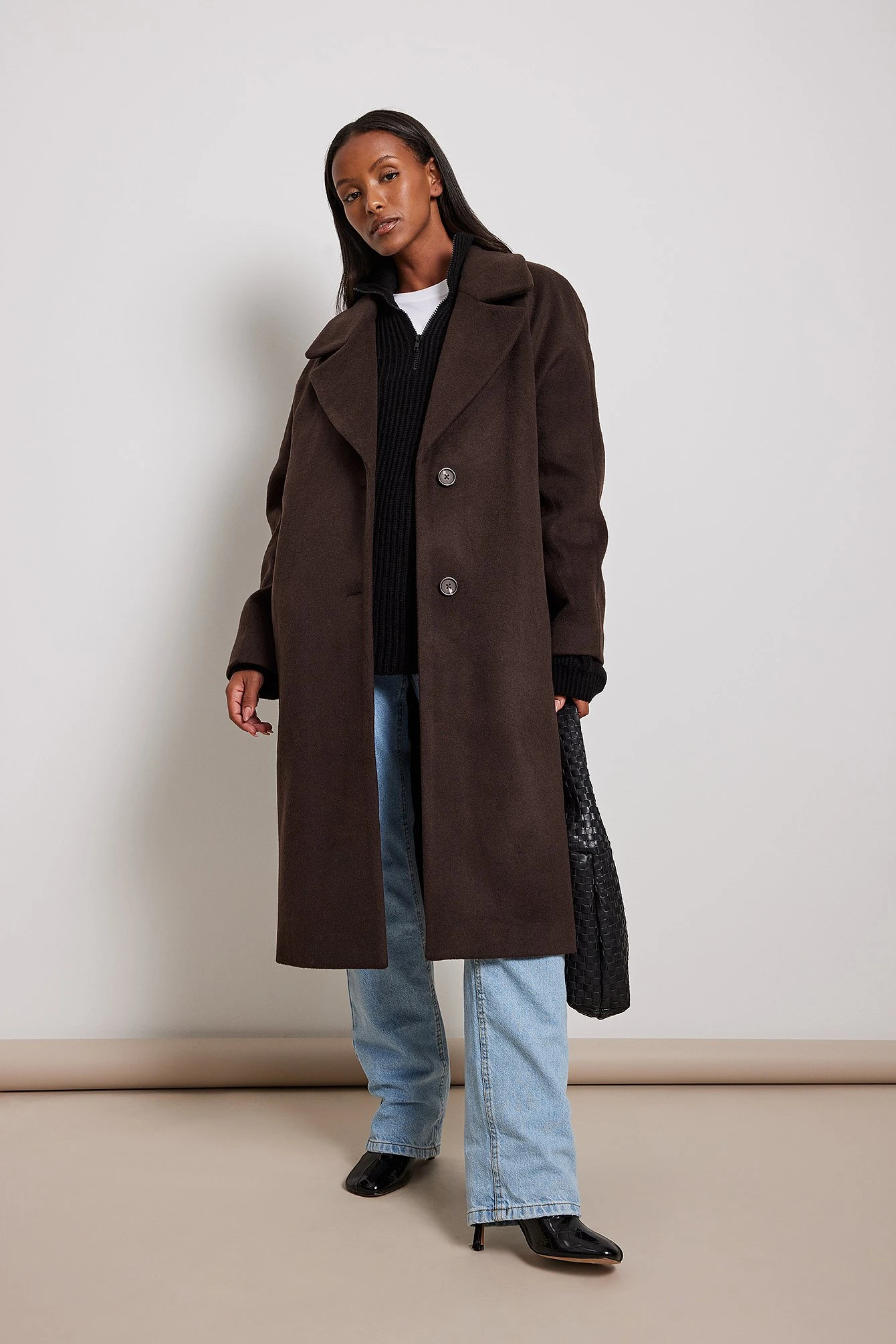 This coat is oversized and features a lapel design, a double button closure and side pockets.